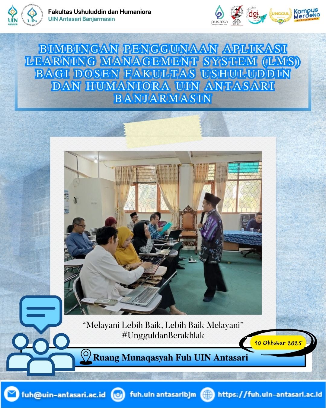 Banjarmasin, 10 Oktober 2025 — Seluruh Dosen Fakultas Ushuluddin dan Humaniora (FUH) UIN Antasari Banjarmasin terlihat antusias mengikuti Bimbingan Penggunaan Learning Management System (LMS) yang dilaksanakan pada Jum’at (10/10/2025) di Ruang Munaqasyah FUH.