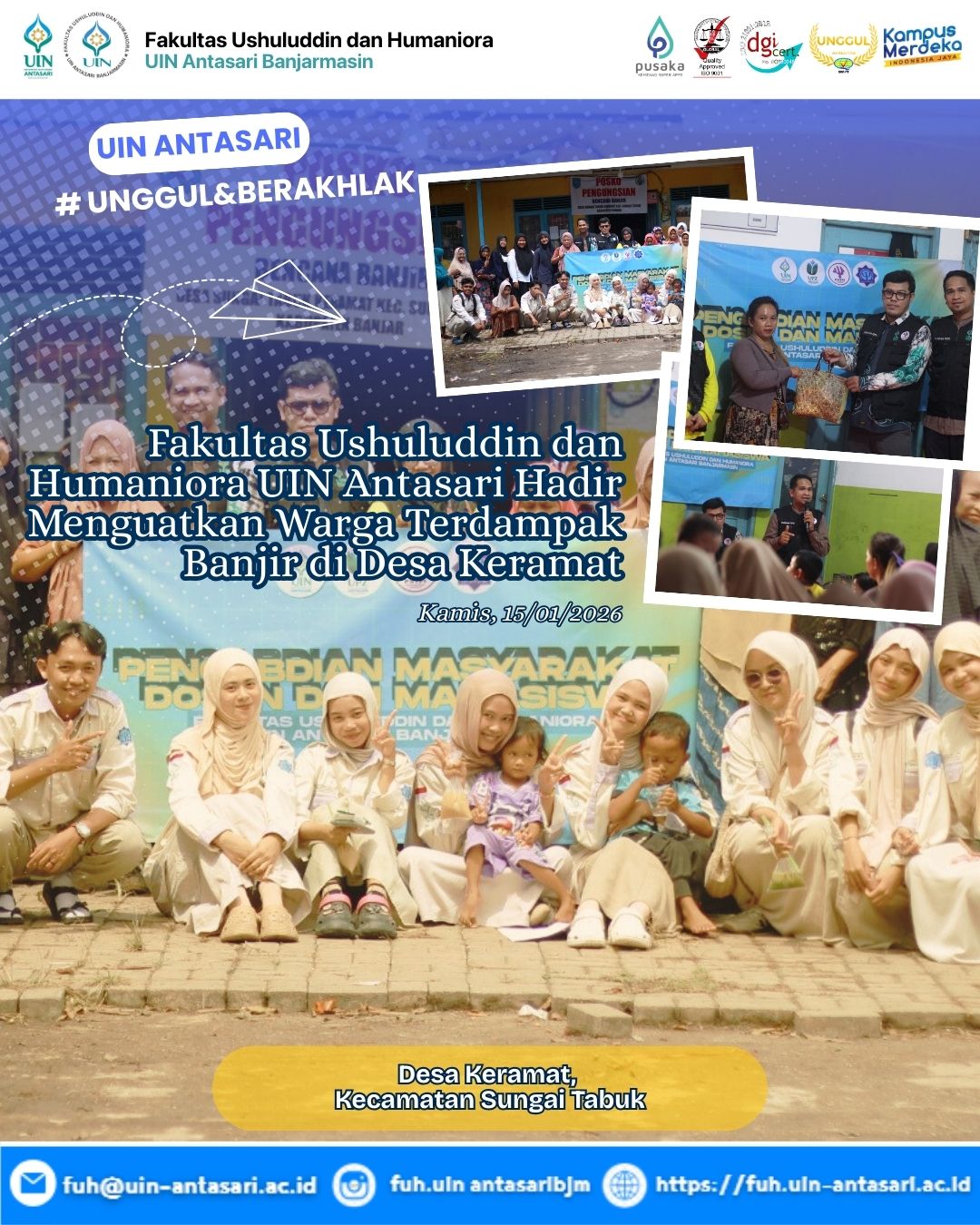 Banjarmasin — (15/1) Fakultas Ushuluddin dan Humaniora (FUH) UIN Antasari Banjarmasin kembali menegaskan komitmennya dalam pengabdian kepada masyarakat melalui kegiatan kemanusiaan di Desa Keramat, Kecamatan Sungai Tabuk. Kegiatan ini dilaksanakan di posko pengungsian warga terdampak banjir dan melibatkan sinergi dosen …