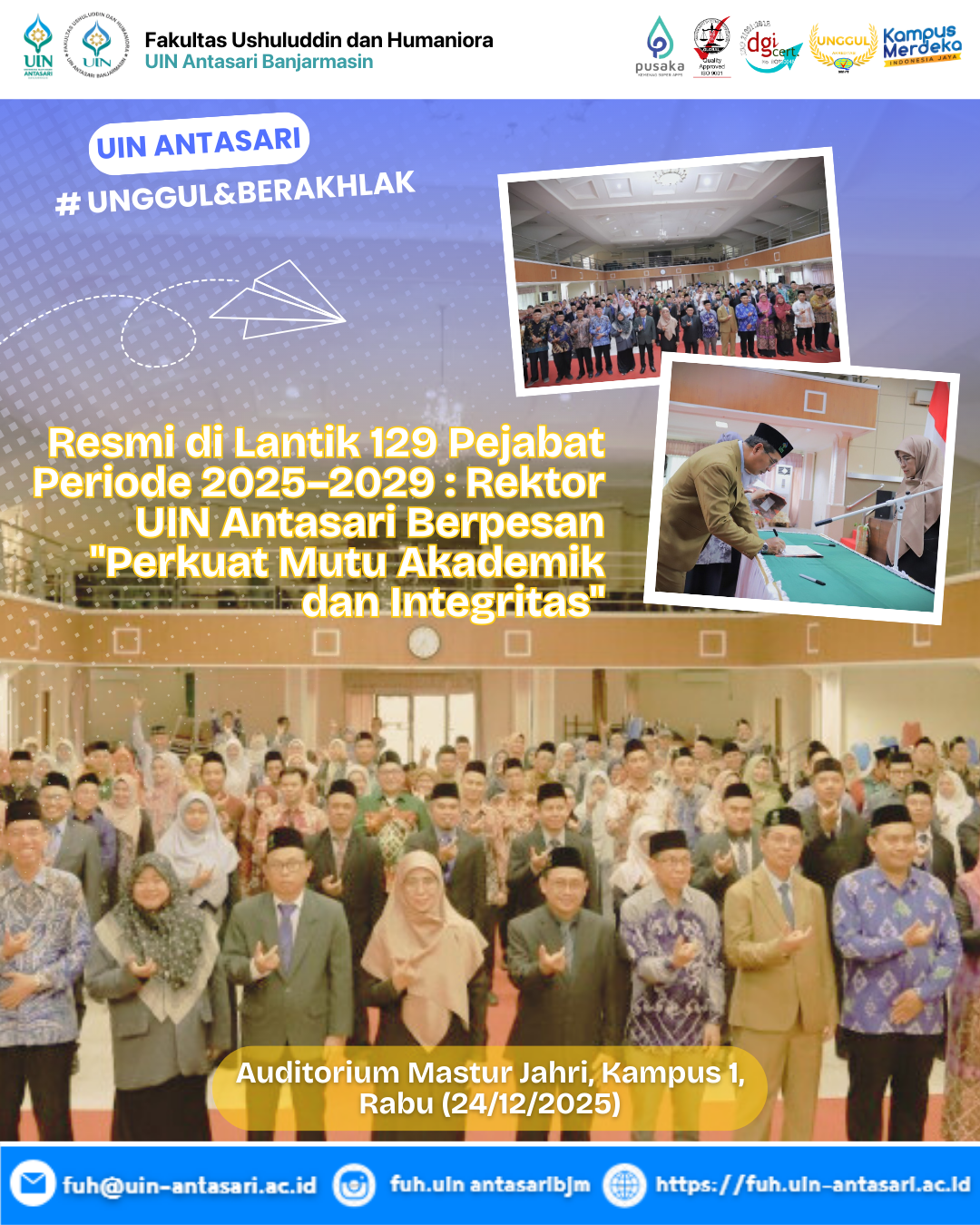 BANJARMASIN – Pimpinan dan sivitas akademika Fakultas Ushuluddin dan Humaniora (FUH) Universitas Islam Negeri Antasari Banjarmasin menyampaikan ucapan selamat dan apresiasi atas pencapaian jabatan akademik Guru Besar kepada dua dosen FUH dalam bidang Rumpun Ilmu Agama. Dua akademisi tersebut adalah …