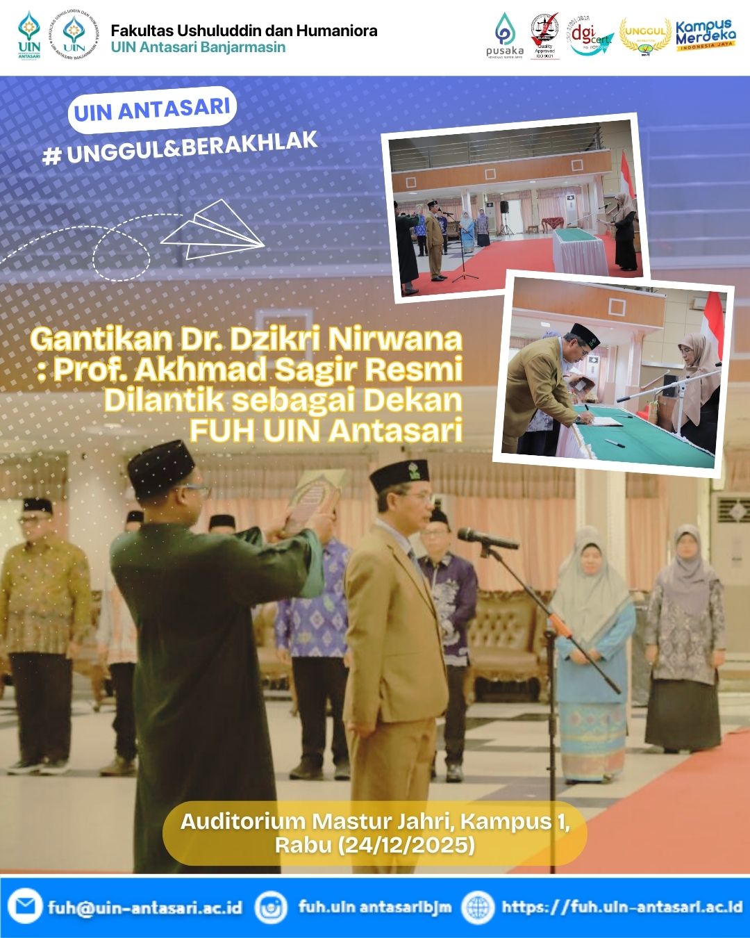 BANJARMASIN – Rektor Universitas Islam Negeri (UIN) Antasari, Prof. Dr. Hj. Nida Mufidah, M.Pd., secara resmi melantik Prof. Dr. H. Akhmad Sagir, M.Ag. sebagai Dekan Fakultas Ushuluddin dan Humaniora (FUH) untuk sisa masa jabatan periode 2025–2029. Prosesi pengambilan sumpah jabatan …