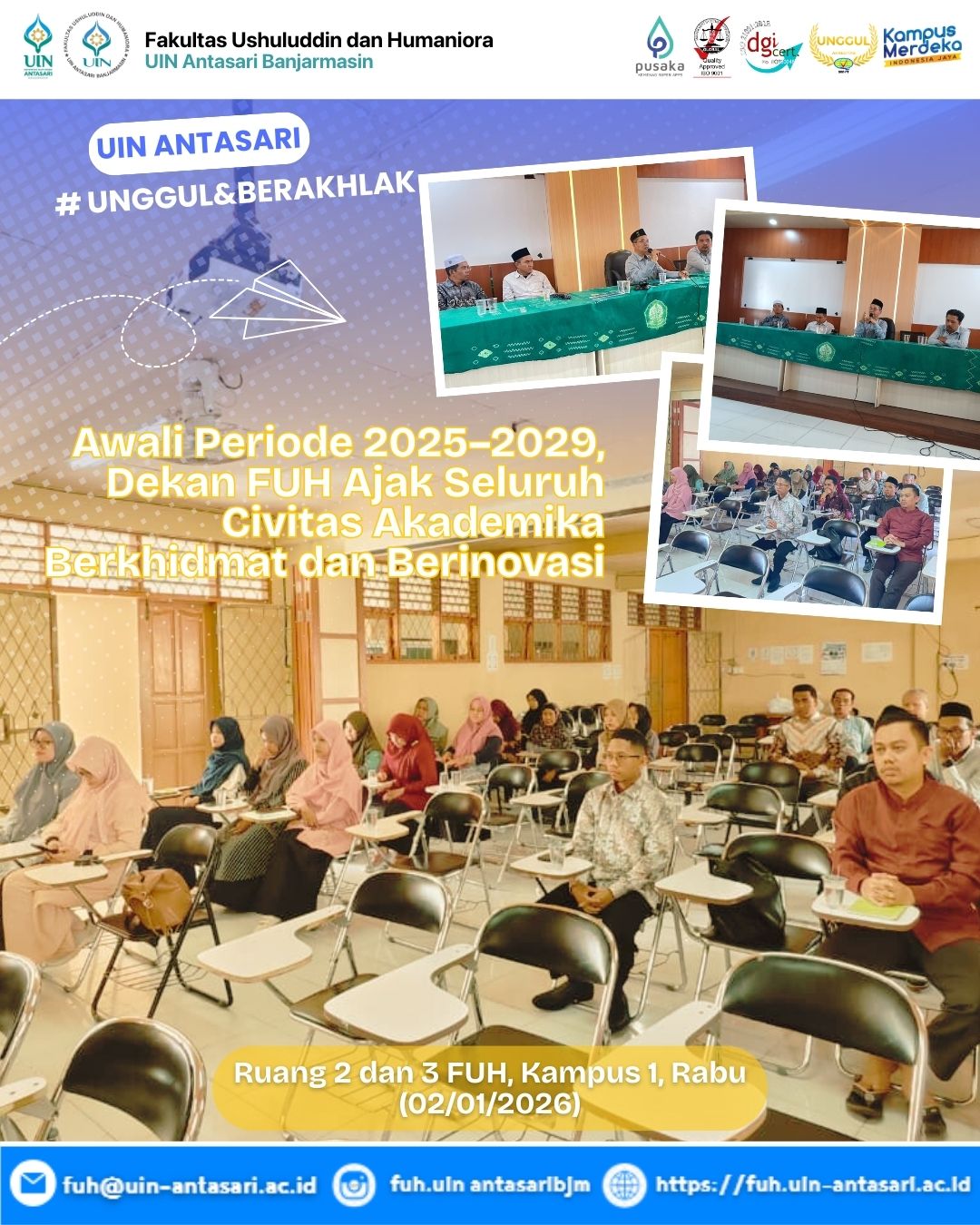 BANJARMASIN – Mengawali kalender kerja tahun 2026, Fakultas Ushuluddin dan Humaniora (FUH) UIN Antasari Banjarmasin menggelar pertemuan silaturrahmi dan koordinasi perdana pada Jumat, 2 Januari 2026. Pertemuan yang berlangsung di Ruang 2 dan 3 FUH Kampus 1 ini menandai dimulainya …