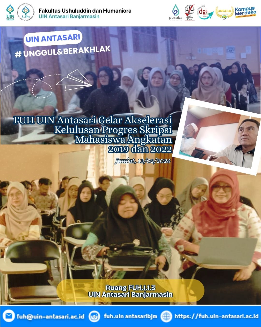 Banjarmasin – Fakultas Ushuluddin dan Humaniora UIN Antasari Banjarmasin melaksanakan kegiatan penyampaian progres penyelesaian tugas akhir sekaligus layanan karantina dan konsultasi skripsi bagi mahasiswa angkatan 2019 dan 2022, Jumat (13/2/2026). Kegiatan ini berlangsung di ruang FUH.1.1.3 dan diikuti oleh mahasiswa …