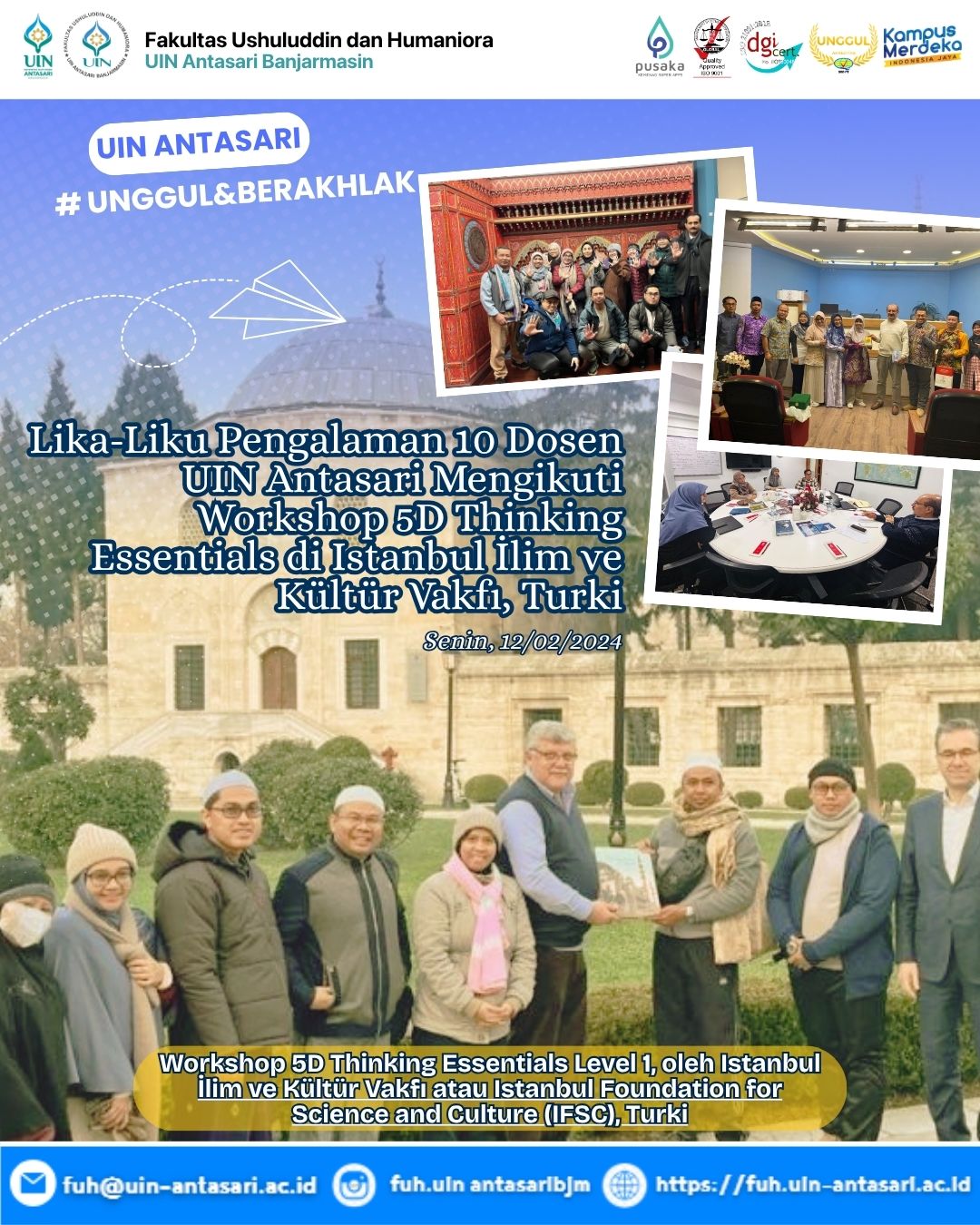 ISTANBUL – Menjelang pukul 8 pagi waktu Istanbul, 10 dosen Universitas Islam Negeri Antasari Banjarmasin sudah bersiap dalam ruangan. Sampai sore hari mereka mengaktifkan laptop, membuka lembaran buku catatan, membaca kumpulan materi, mengarahkan diri pada layar, dan berkonsentrasi penuh menyimak paparan …