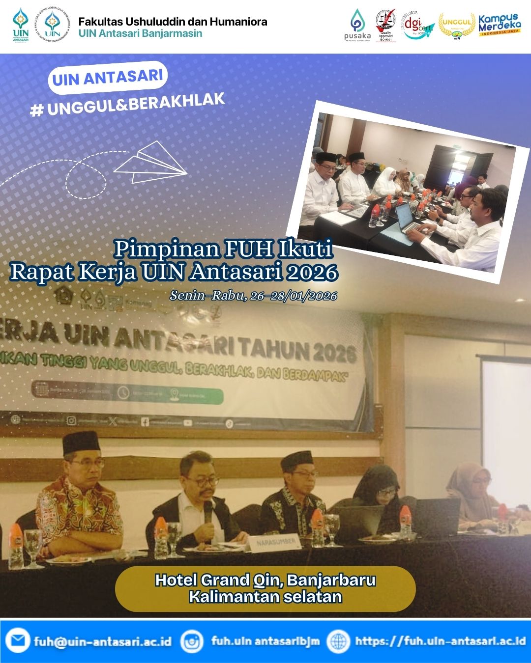 Banjarbaru — Seluruh unsur pimpinan Fakultas Ushuluddin dan Humaniora (FUH) UIN Antasari Banjarmasin menunjukkan partisipasi aktif dalam Rapat Kerja (Raker) UIN Antasari Tahun 2026 yang dilaksanakan pada Senin–Rabu, 26–28 Januari 2026, bertempat di Hotel Grand Qin, Banjarbaru. Raker UIN Antasari …