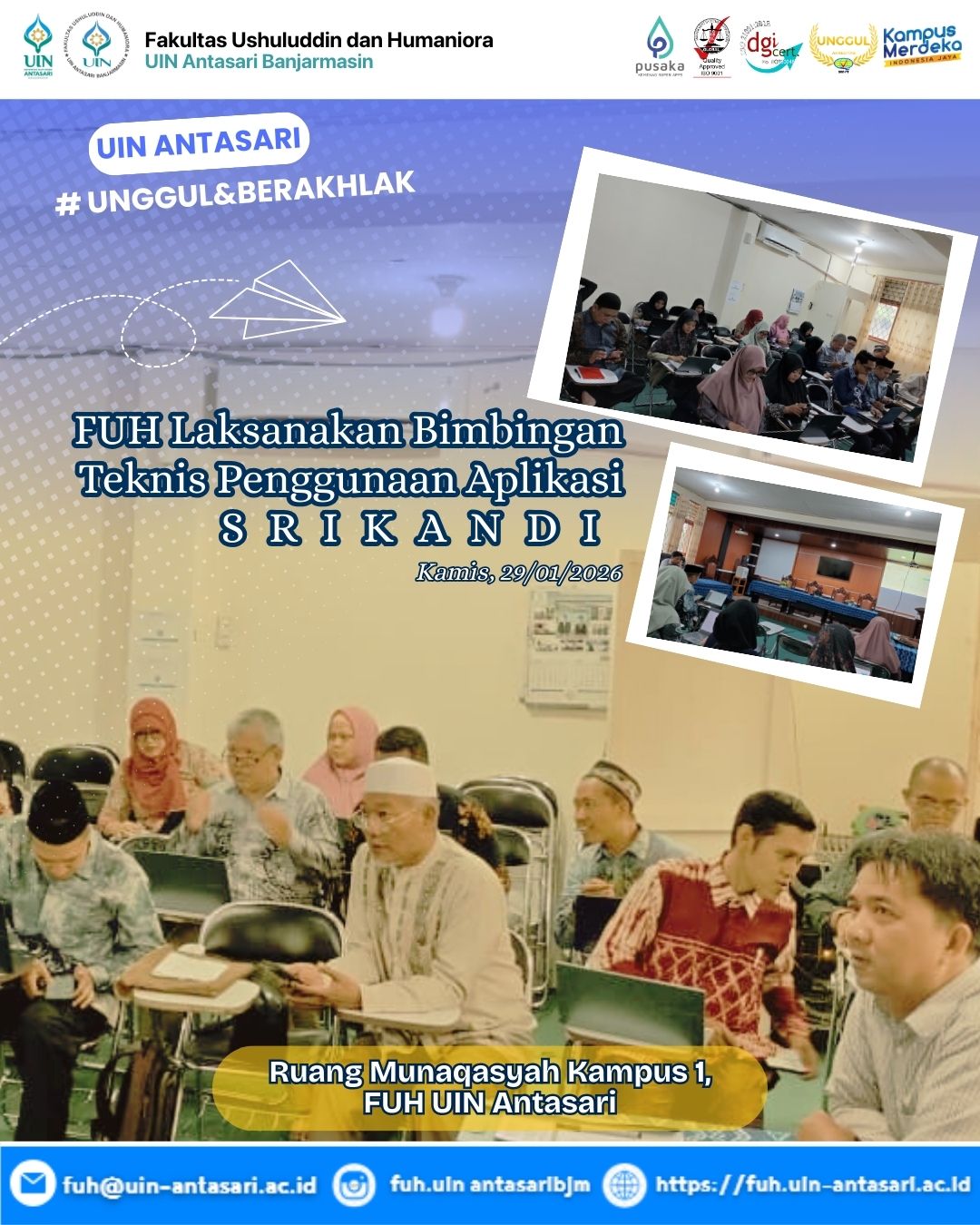 Fakultas Ushuluddin dan Humaniora menyelenggarakan kegiatan Bimbingan Teknis (Bimtek) Penggunaan Aplikasi SRIKANDI bagi pengelola program studi, tenaga kependidikan, serta calon dosen di lingkungan fakultas. Kegiatan ini dilaksanakan pada Kamis, 29 Januari 2026, bertempat di Ruang Munaqasyah Kampus 1, dan dimulai …