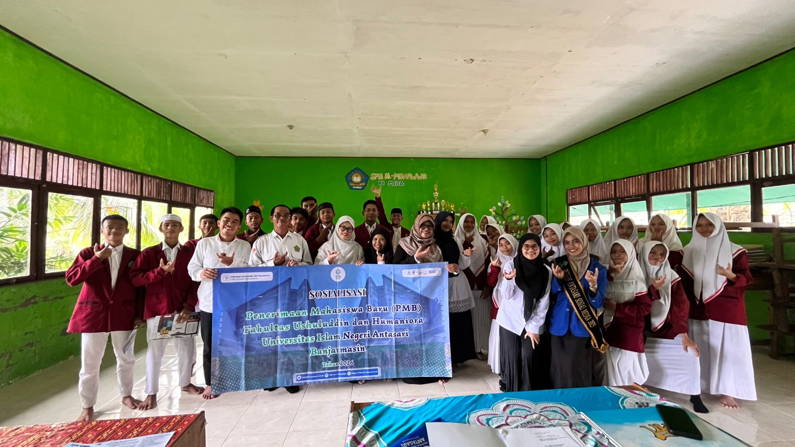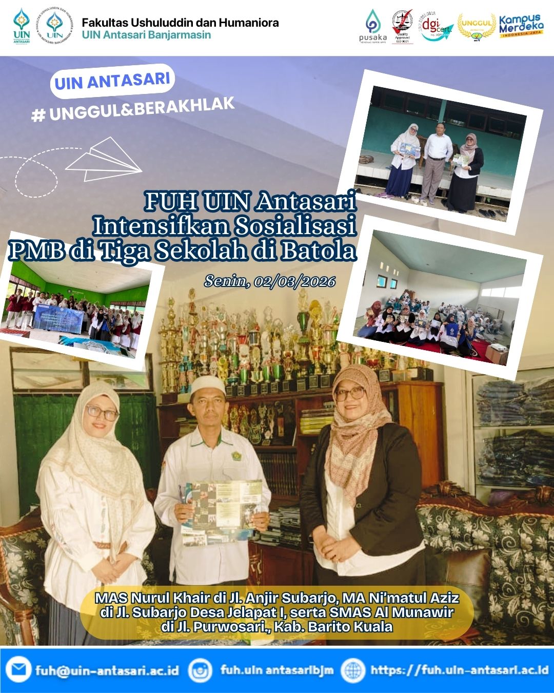 Banjarmasin – Fakultas Ushuluddin dan Humaniora UIN Antasari Banjarmasin terus memperluas akses pendidikan tinggi melalui kegiatan Sosialisasi Penerimaan Mahasiswa Baru (PMB) yang dilaksanakan pada Senin (2/3/2026). Kegiatan ini menyasar tiga sekolah menengah di Kabupaten Barito Kuala (Batola), yakni MAS Nurul Khair di Jalan Anjir Subarjo, MA Ni’matul Aziz di Jalan Subarjo Desa Jelapat I, serta SMAS Al Munawir di Jalan Purwosari.
