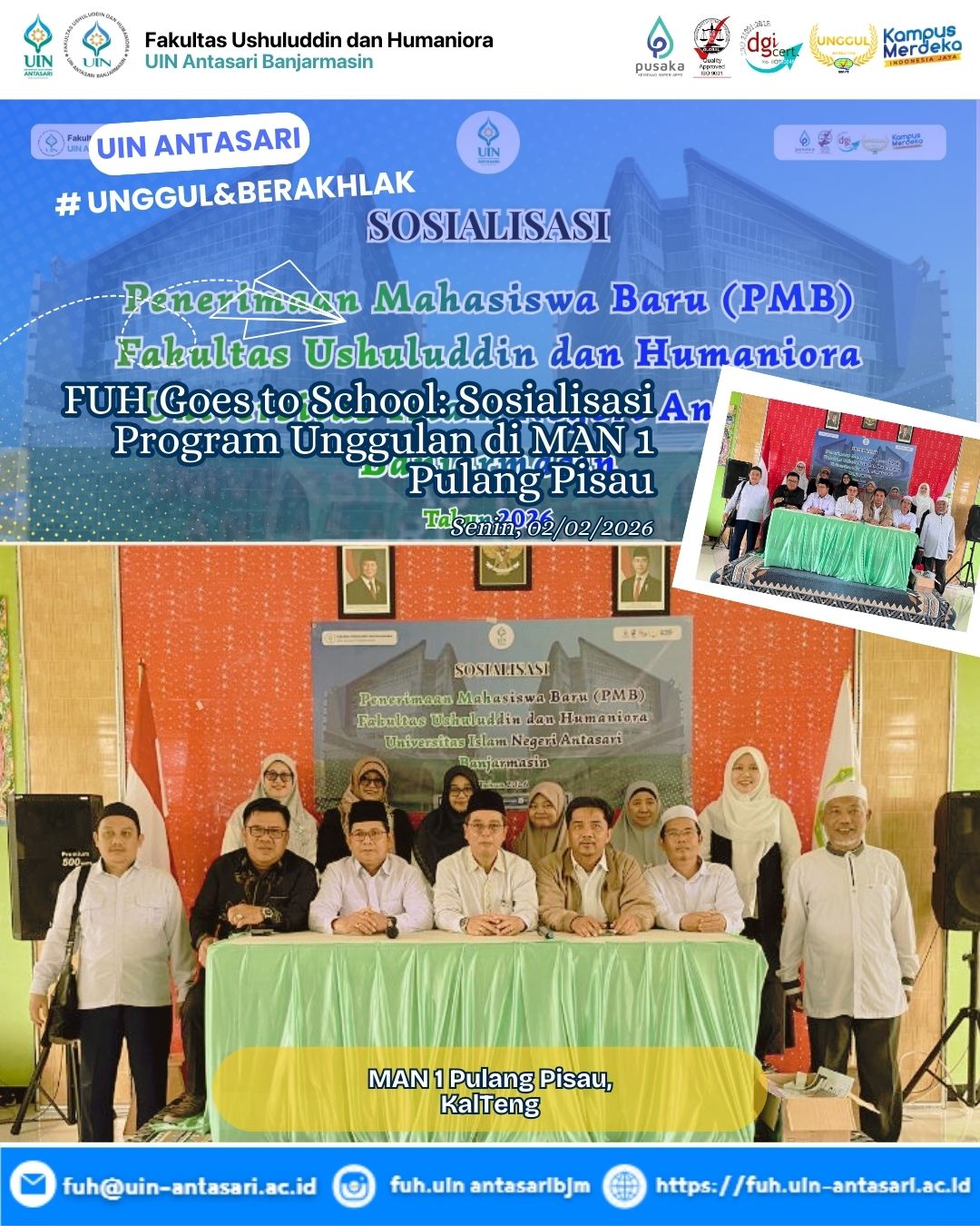 “Kami mengundang siswa-siswi terbaik MAN 1 Pulang Pisau untuk bergabung menjadi bagian dari keluarga besar FUH. Komitmen kami adalah menyelenggarakan pendidikan berkualitas yang memadukan kedalaman ilmu Islam dengan nilai-nilai kemanusiaan,” ujar salah satu perwakilan pimpinan prodi.