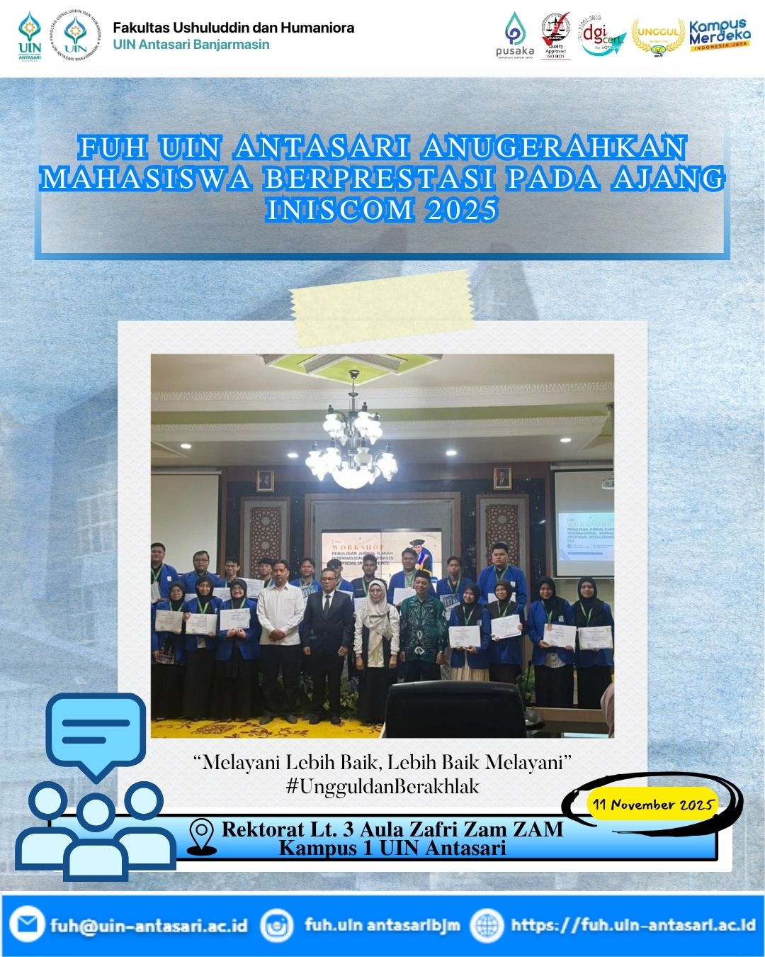Berikut daftar nama-nama mahasiswa/i FUH UIN Antasari Banjarmasin yang berhasil menorehkan prestasinya pada INISCOM 2025: