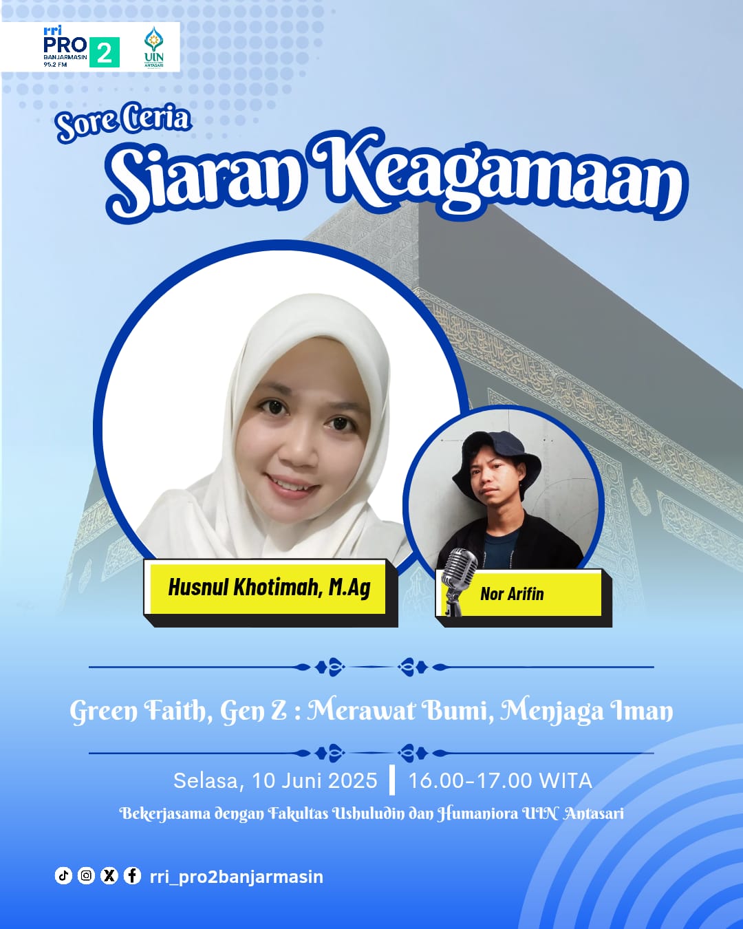 Selasa 10 juni 2025 bertempat di Gedung RRI PRO2 Kota Banjarmasin, terselenggaranya kegiatan Sosialiasi Keagamaan kerjasama RRI dan UIN Antasari. Fakultas Ushuluddin dan Humaniora, Kampus UIN Antasari Banjarmasin, dalam upaya mendukung kegiatan Sosialisasi Keagamaan, Ibu Husnul Khotimah., M.Ag-Seorang Dosen Fakultas Ushuluddin dan Humaniora sekaligus aktif sebagai pemerhati lingkungan. Dalam sebuah kesempatan sebagai Narasumber Kegiatan Sosialisasi Keagamaan RRI PRO2, Beliau menyampaikan hal Inspiratif seputar Green Faith bagi generasi Z yang bertujuan untuk meningkakan pemahaman tentang bagaimana Agama mengatur cinta terhadap lingkungan. Green Faith ini juga membahas isu-isu penting terkait lingkungan dan iklim lintas agama, serta fokus pada bagaimana agama-agama dapat berperan dalam melindungi bumi dan membangun komunitas yang berkelanjutan.