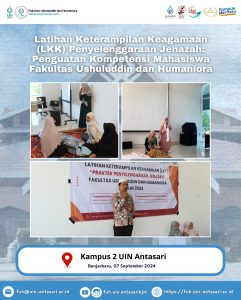 Banjarbaru, 7 September 2024 — Fakultas Ushuluddin dan Humaniora, UIN Antasari, sukses menggelar kegiatan Latihan Keterampilan Keagamaan (LKK) Penyelenggaraan Jenazah di Kampus 2 Banjarbaru. Kegiatan ini diikuti oleh mahasiswa-mahasiswi angkatan 2022, yang terbagi dalam dua tahap. Tahap pertama dilaksanakan di Kampus 2 Banjarbaru dengan peserta dari Jurusan Ilmu Al-Qur’an dan Tafsir serta Psikologi Islam sebanyak 175 orang. Sementara itu, tahap kedua akan dilaksanakan di Kampus 1 Banjarmasin untuk jurusan Akidah dan Filsafat Islam serta Studi Agama-Agama, yang akan diikuti oleh 80 orang mahasiswa.