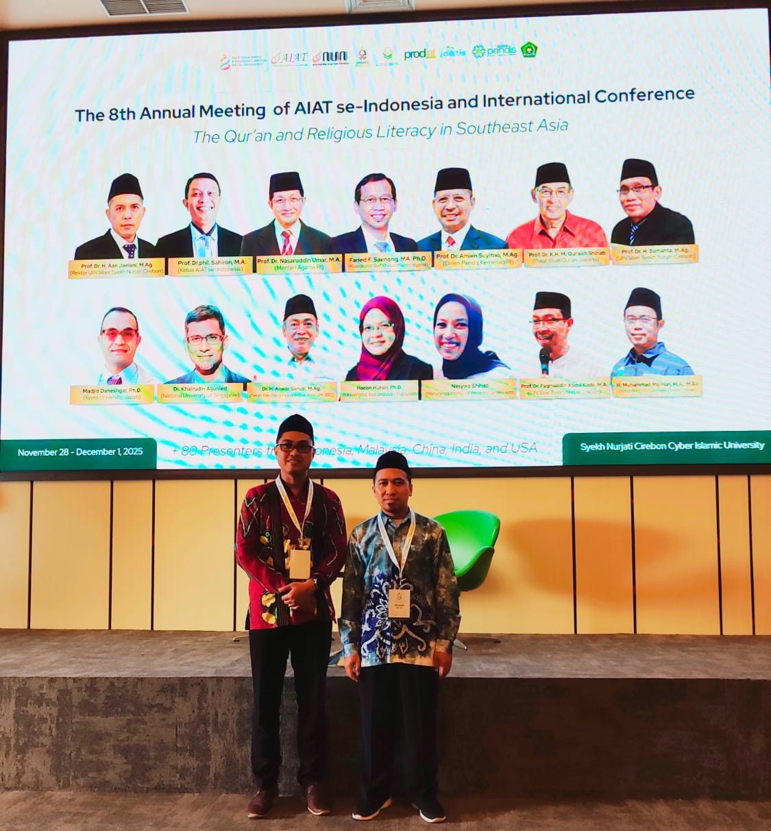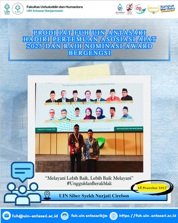 Dua dosen IAT FUH UIN Antasari, Riza Saputra, M.A. (Kaprodi Ilmu Al-Qur’an dan Tafsir) dan Najib Irsyadiy, M.Hum (Ketua Program Khusus Ulama)., menjadi delegasi yang terlibat aktif dalam The 8th Annual Meeting of AIAT se-Indonesia and International Conference yang diselenggarakan oleh Asosiasi Ilmu Al-Qur’an dan Tafsir (AIAT) di UIN Siber Syekh Nurjati Cirebon, 28 November hingga 1 Desember 2025.