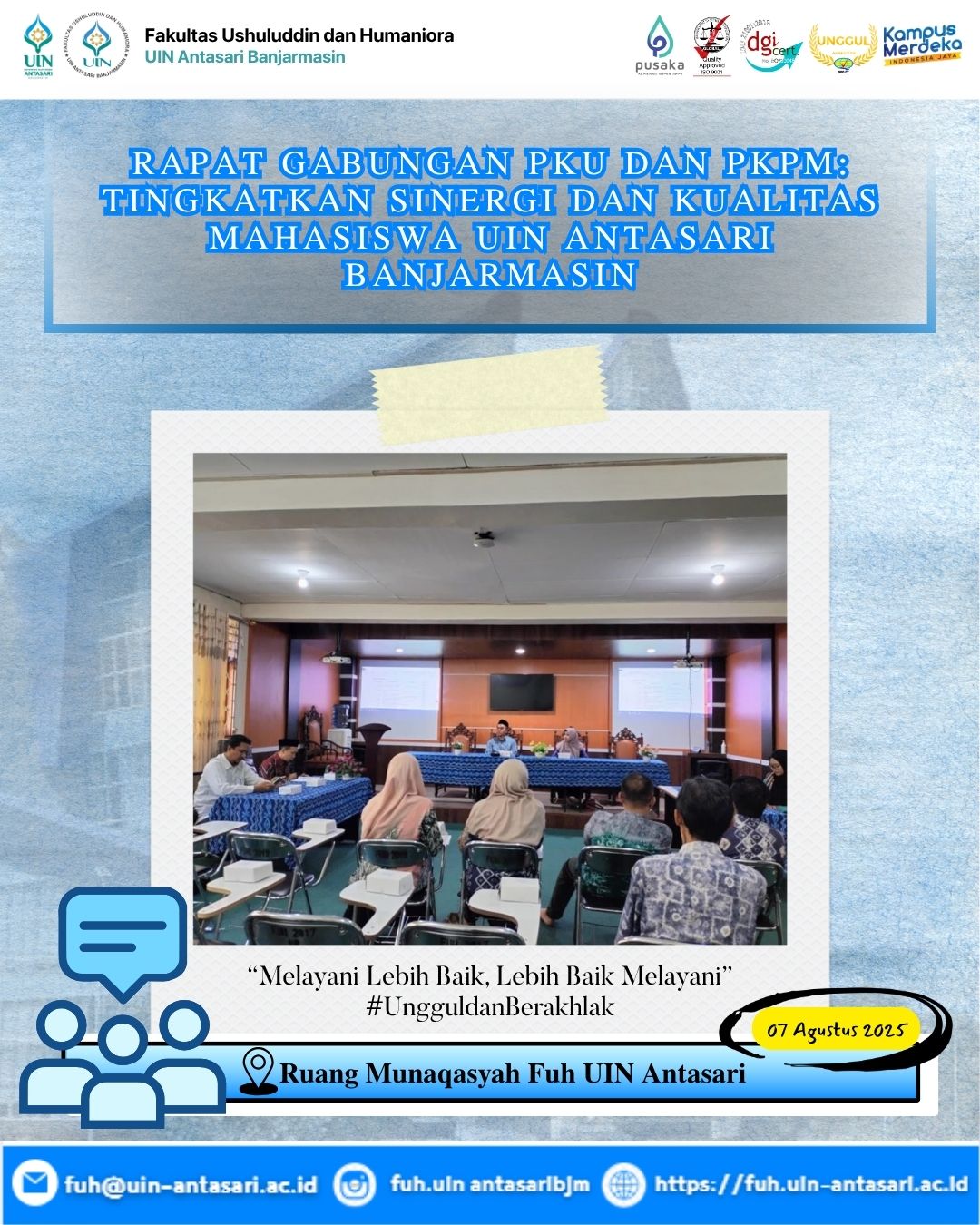 Banjarmasin, 7 Agustus 2025 — Fakultas Ushuluddin dan Humaniora (FUH) bersama Fakultas Syariah UIN Antasari Banjarmasin menyelenggarakan Rapat Gabungan Program Khusus Ulama (PKU) dan Program Khusus Perbandingan Mazhab (PKPM). Kegiatan berlangsung di Ruang Munaqasyah FUH dan diikuti oleh Dekan dan Wakil Dekan kedua fakultas, Ketua dan Sekretaris Prodi, Dosen, Tenaga Kependidikan, serta pengelola PKU dan PKPM.