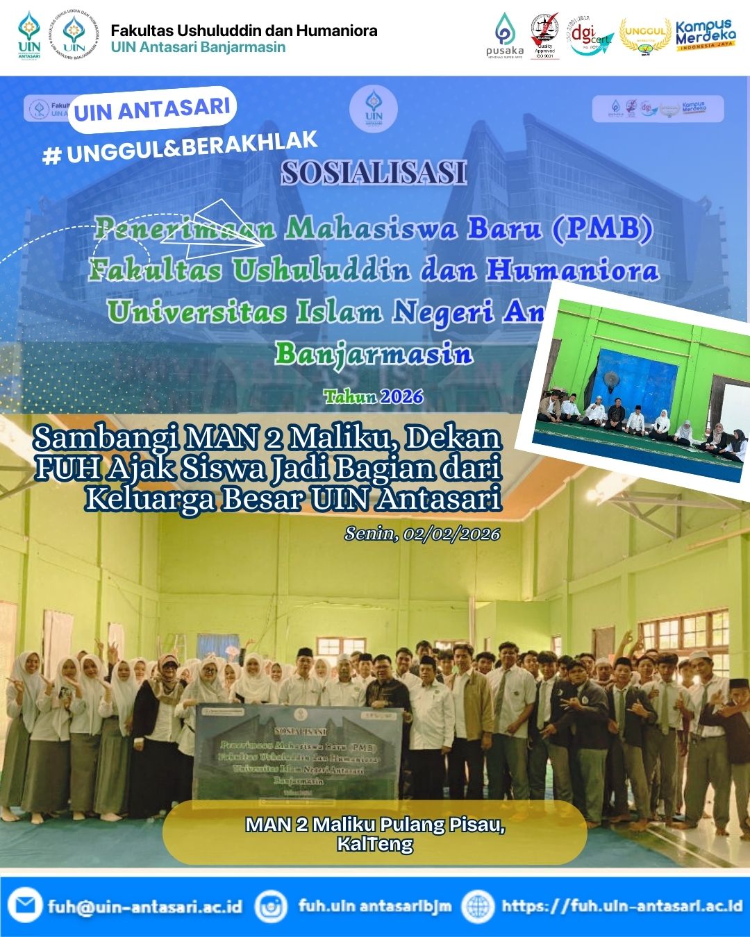 MALIKU – Menjelang pembukaan penerimaan Mahasiswa Baru Fakultas Ushuluddin & Humaniora UIN Antasari Banjarmasin tahun Akademik 2026/2027 menyelenggarakan kegiatan sosialisasi penerimaan Mahasiswa Baru di Madrasah Aliyah Negeri (MAN) 2 Maliku pada Senin (2/2/2026).
