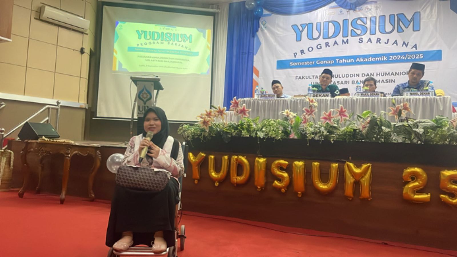 Banjarmasin, 11/09/2025 – Salah satu momen paling menyentuh dalam Yudisium Fakultas Ushuluddin dan Humaniora (FUH) UIN Antasari adalah ketika Fatimauzzahra, S.Psi., salah satu yudisiawati yang hadir dengan kursi roda menyampaikan pesan dan kesannya di hadapan seluruh civitas akademika juga hadirin.