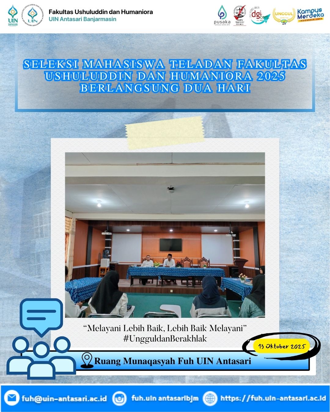 Banjarmasin — Fakultas Ushuluddin dan Humaniora (FUH) UIN Antasari Banjarmasin menggelar kegiatan seleksi Mahasiswa Teladan selama dua hari, mulai tanggal 13 hingga 14 Oktober 2025. Kegiatan ini diikuti oleh 10 mahasiswa yang merupakan perwakilan dari berbagai program studi, yaitu Prodi Ilmu Al-Qur’an dan Tafsir, Prodi Aqidah dan Filsafat Islam, Prodi Studi Agama-Agama, dan Prodi Psikologi Islam.